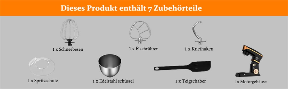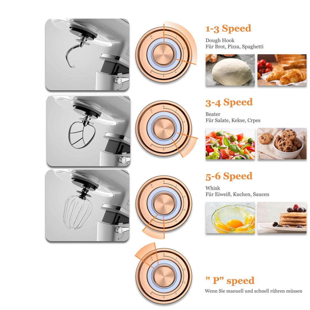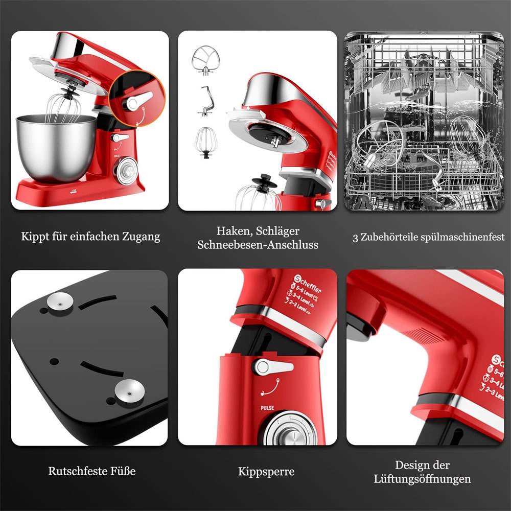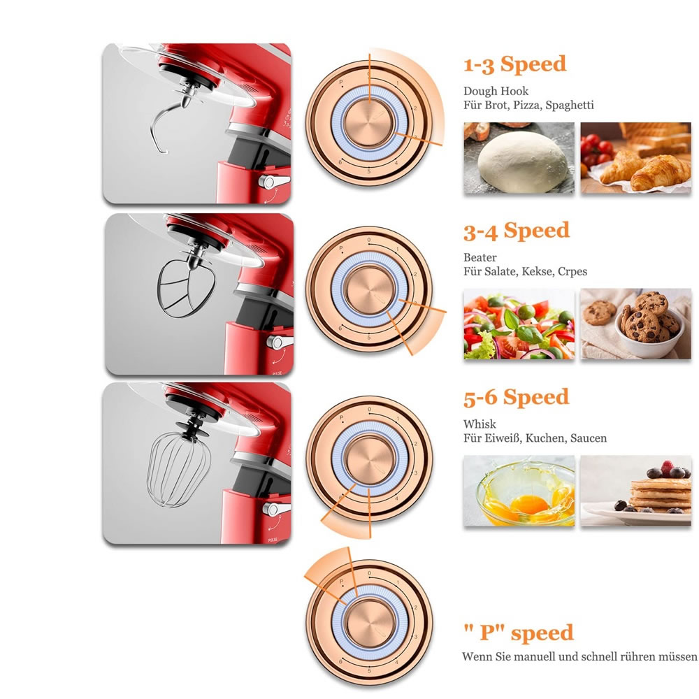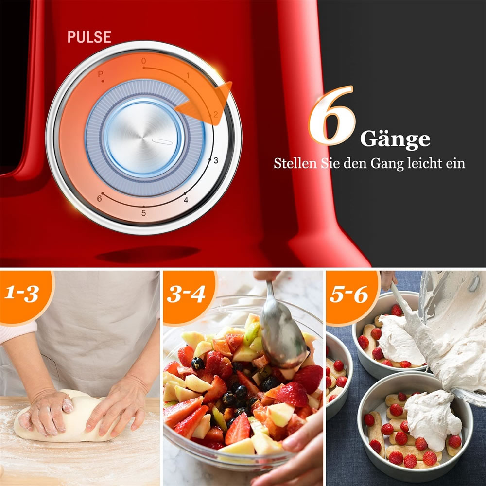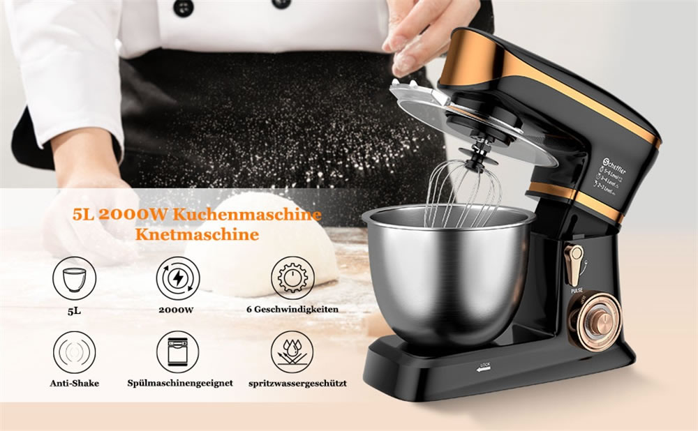 Die Teig Knetmaschine mit drei Zubehörteilen: 1-3 Geschwindigkeiten für Knethaken(Schwere Mischungen-Brot, Pizza, Spaghetti), 3-4 Geschwindigkeiten für Rührbesen (mittelschwer gemischt - Salat, Kekse, Crêpes),5 -6 Geschwindigkeiten für einen Schneebesen, (Leichte Mischungen-Sahne, Ei, Kuchen, Soßen). Mehrzweckaufsätze sind im Lieferumfang enthalten: 1x Scheffler Küchenmaschine (2000W), 1x 5 L Edelstahlschüssel, 1x Spritzschutz, 1x Teigschaber, 1x mehrsprachiges Handbuch