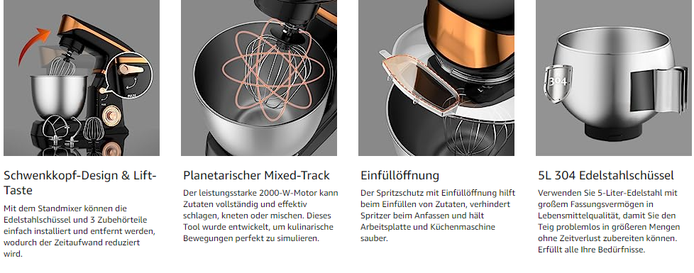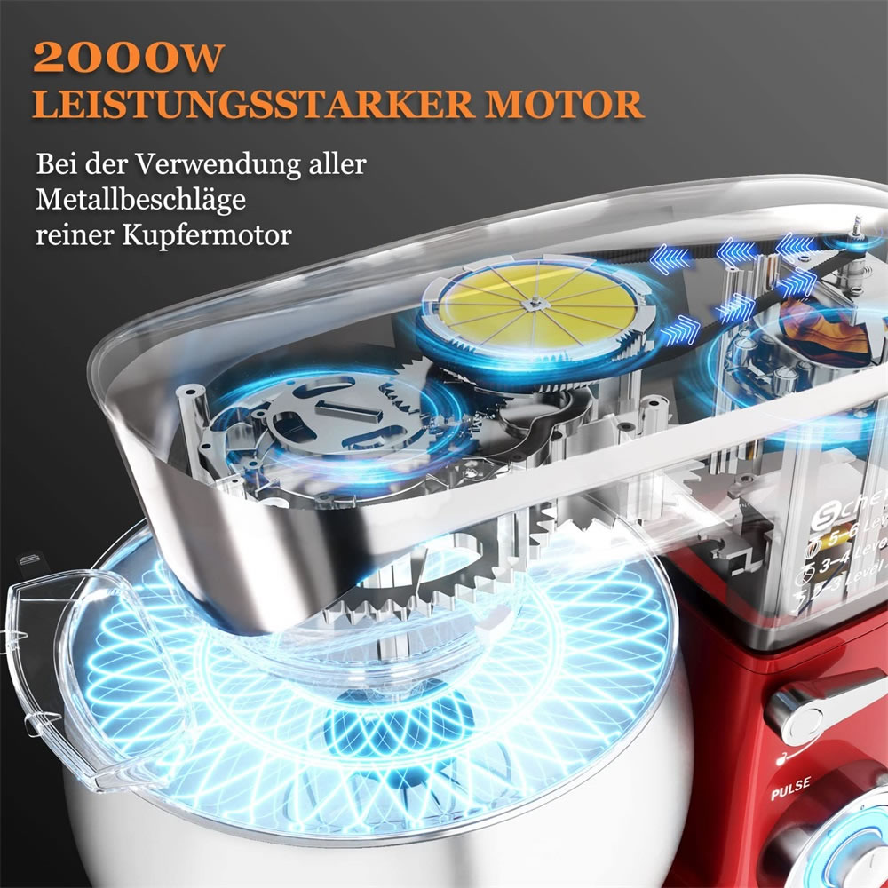 Präziser 6-Gang-Regler lässt Sie zwischen langsamem Rühren und schnellem Mixen wählen, Küchenmaschine XL mit blauem LED-Licht als Betriebsanzeige, der Mixer mit 2000W Hochleistungsmotor aus reinem Kupfermotor und robustem ABS-Gehäuse macht das Mischen schnell und gründlich.