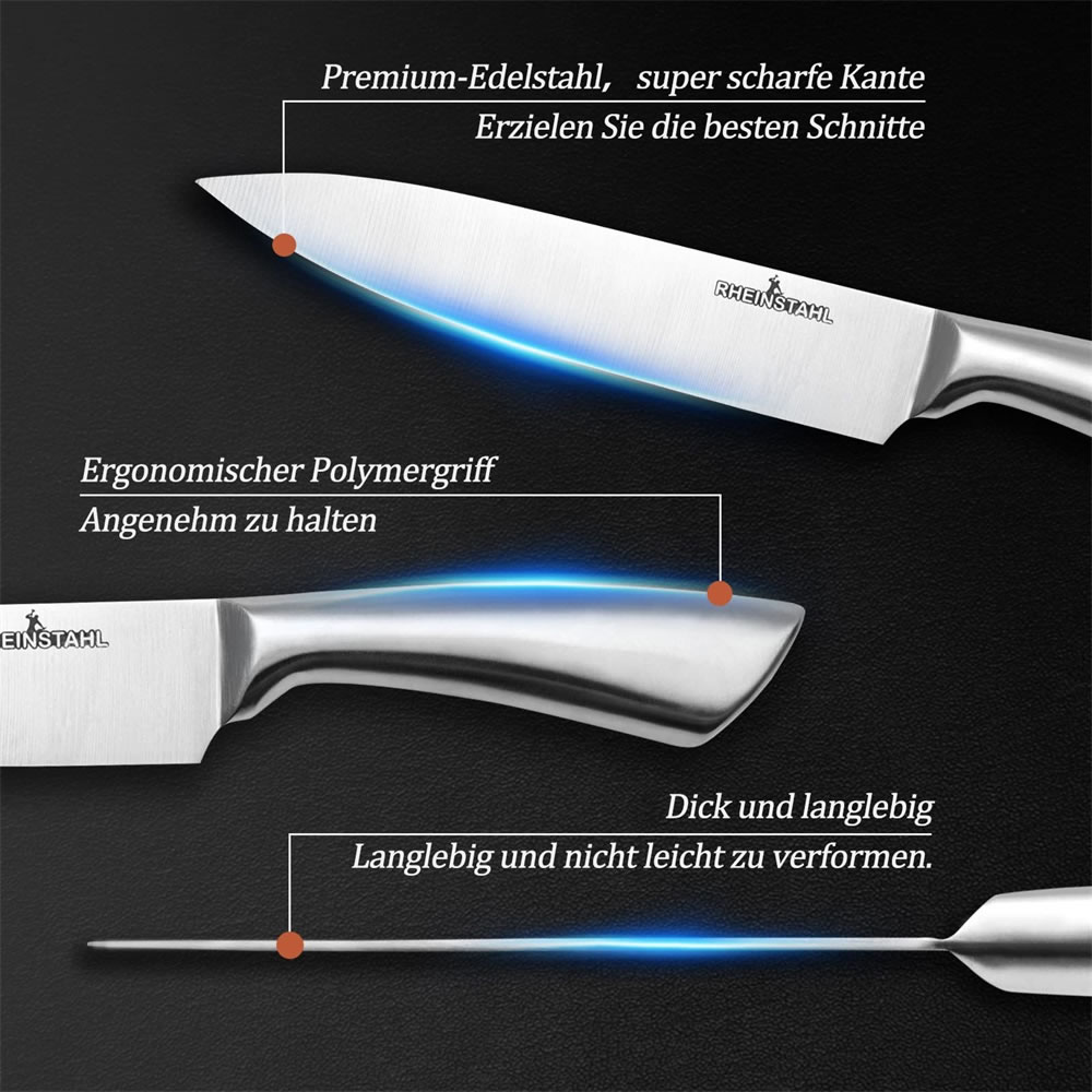 Diese Messer sind aus kohlenstoffreichem Edelstahl gefertigt und verfügen über rasiermesserscharfe Klingen, um eine bestimmte Aufgabe fehlerlos zu erledigen. Der Edelstahl bietet eine hohe Haltbarkeit, Langlebigkeit und eine bemerkenswerte Beständigkeit gegen Späne und Korrosion. Darüber hinaus ist dieses Kochmesserset mit komfortablen, ergonomisch geformten Griffen präzisionsbalanciert und bietet unvergleichliche Kontrolle beim Hacken und Filetieren.