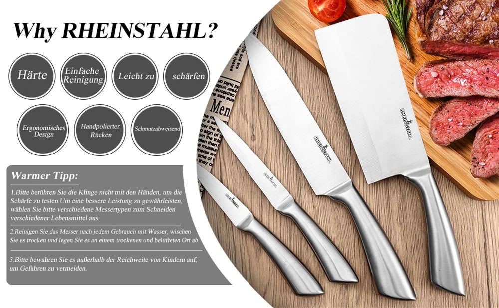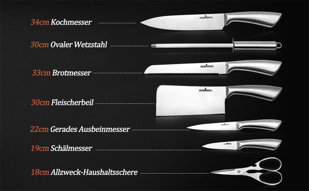 Dieses Messerset beinhaltet alle gängigen Messersets für die Küche, 1x Brotmesser, 1x Kochmesser, 1x Fleischerbeil, 1x gerades Ausbeinmesser, 1x Gemüsemesser, 1x ovaler Wetzstahl, 1xAllzweck-Haushaltsschere,1xMessertasche. Die Krümmung der Klinge ist weich, was für ein präzises Schneiden hilfreich ist. Unterschiedliche Messer erfüllen unterschiedliche Kochbedürfnisse und verhindern den Geschmack der Schnur.