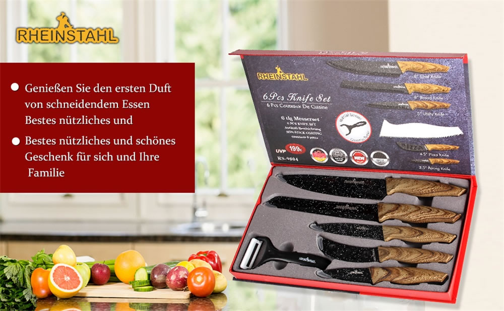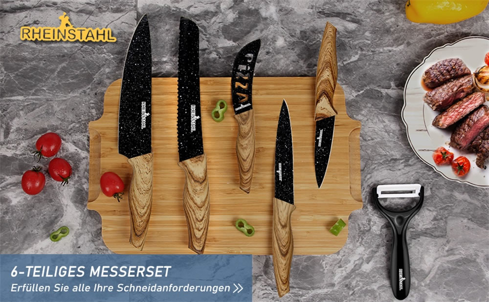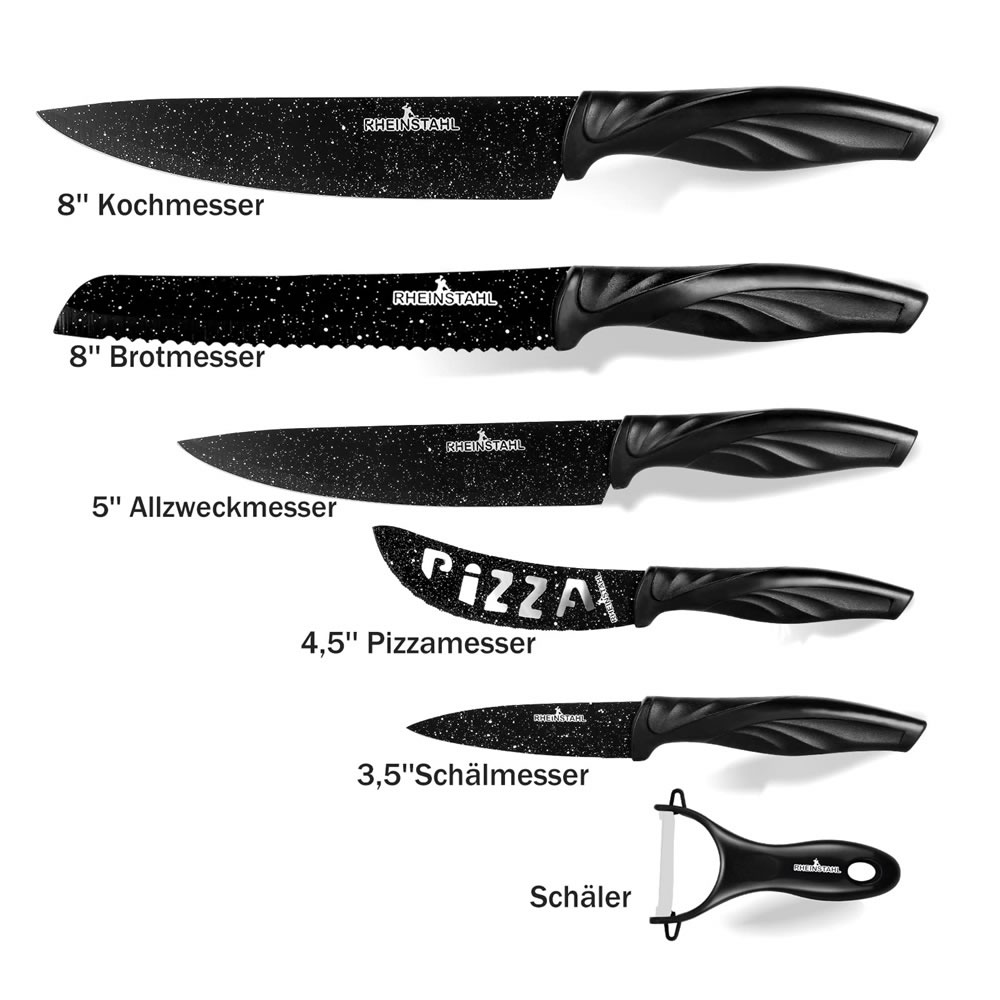 6 teiliges Küchenmesser Set erfüllt alle Ihre Bedürfnisse zum Schneiden von Dingen in der Küche, darunter: 19 cm Kochmesser, 12.5 cm Universalmesser, 20 cm Brotmesser, 11 cm Pizzamesser, 8.5 cm Schälmesser und ein Sparschäler.