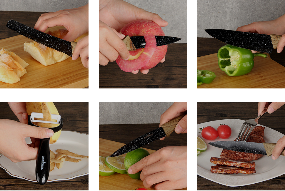 Die Klinge und der ergonomisch geformte Griff bilden eine Einheit und zeichnen sich durch ihre Robustheit und sichere Handhabung aus. Dieses Messerset aus Edelstahl bietet Ihnen überlegene Klingen mit Antihaftbeschichtung sowie ergonomische PP-Griffe. Scharf, robust und praktisch. So können Sie mühelos eine köstliche Mahlzeit zubereiten.