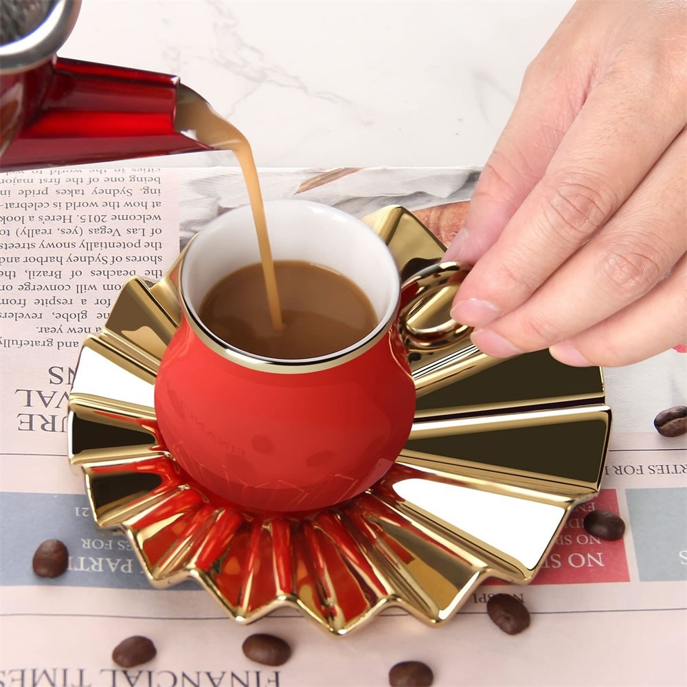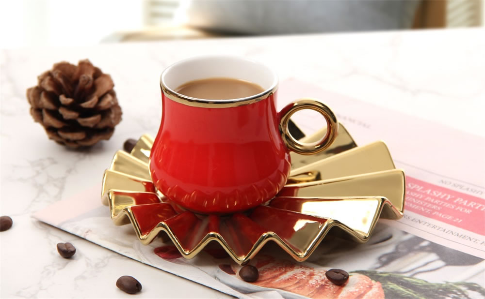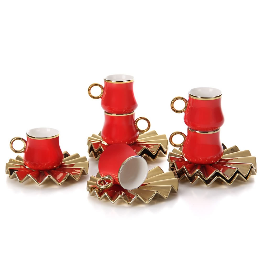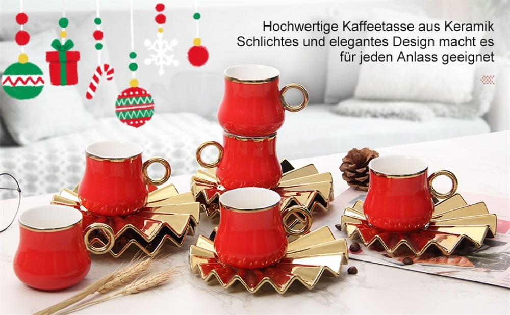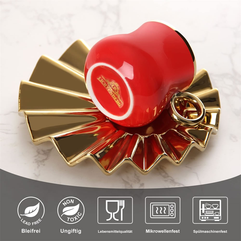 Das Espressotassen Set hat eine einzigartige Form.Kreative Welle Becherhalter mit kleiner Tassen,glänzendes und kräftiges Rot und Gold, was ein luxuriöses und zartes Gefühl vermittelt, das Ihren Tisch erhellen kann. Dieses Set von Espressotassen wird jeder Zusammenkunft eine schöne Note verleihen. Umfassen Sie das exquisite Leben, es muss eine Überraschung im Leben sein!