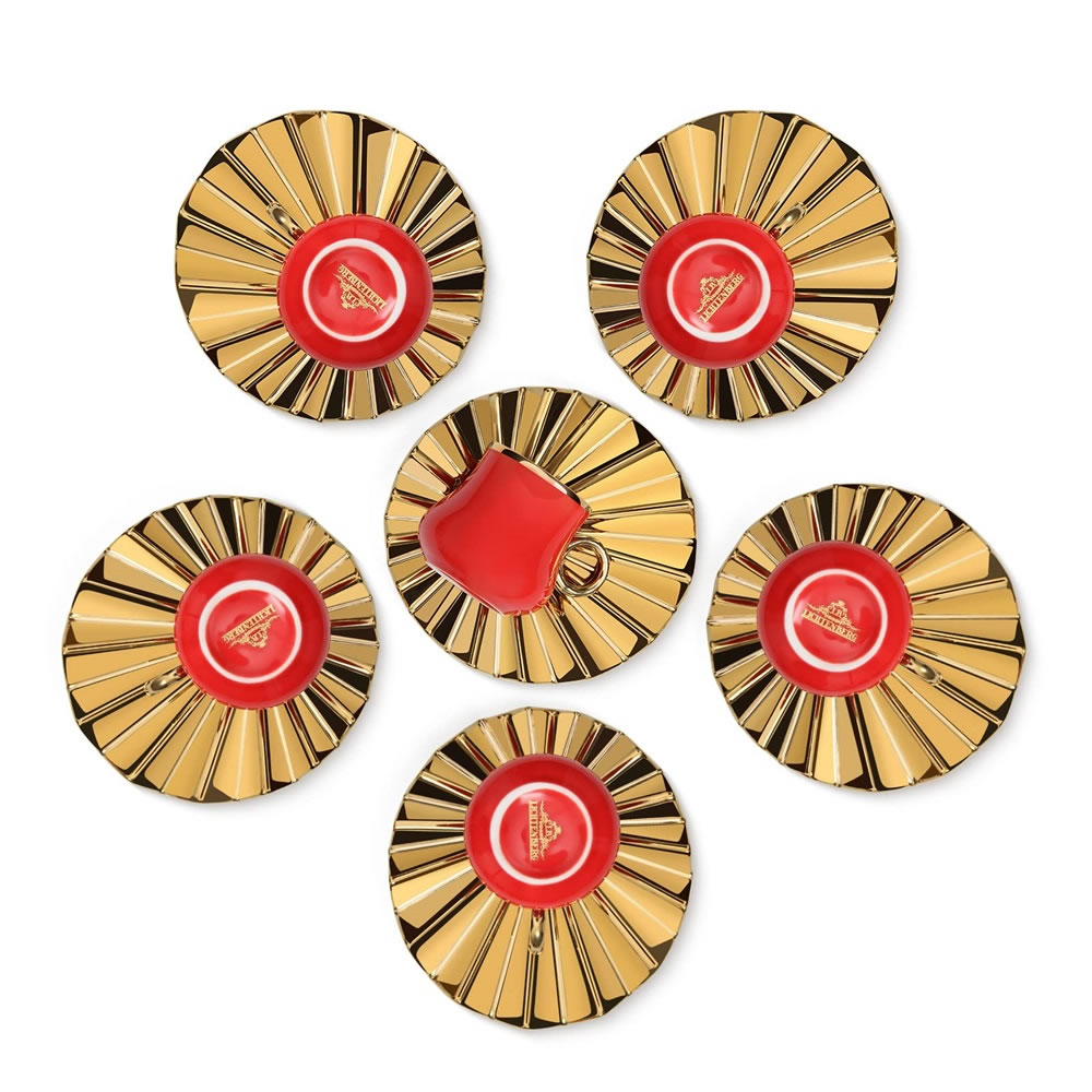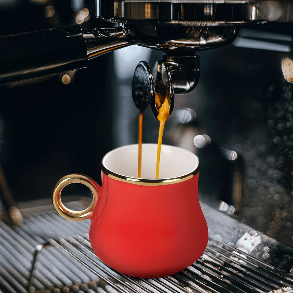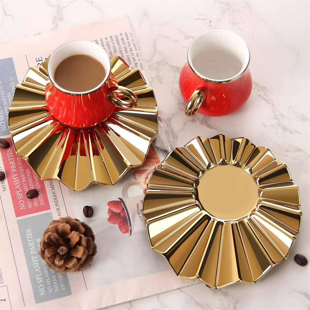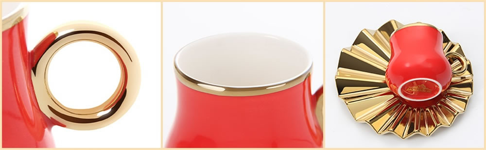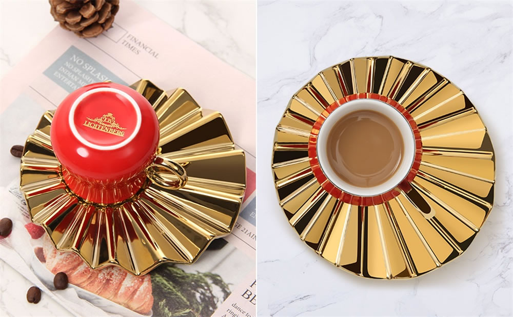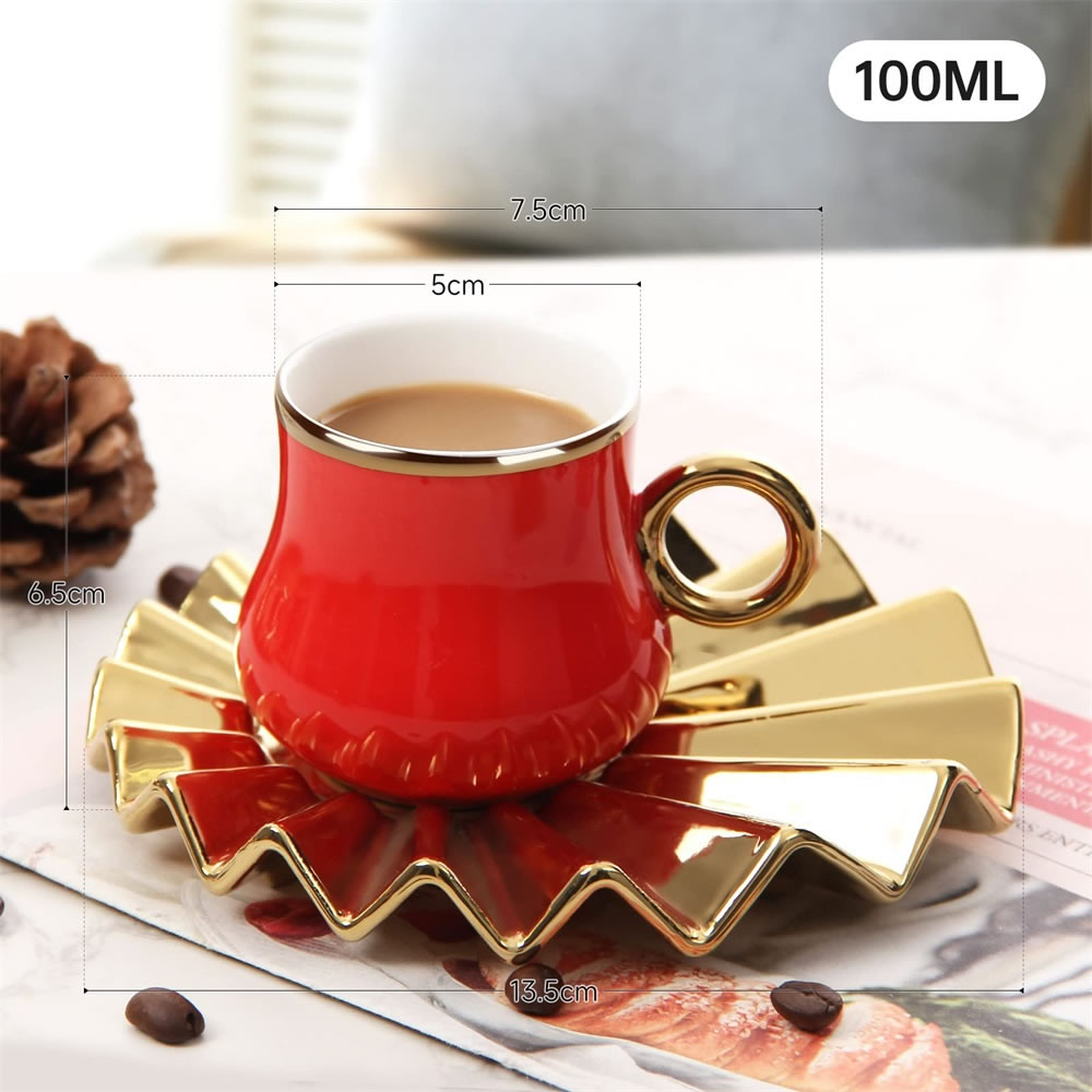 Das Espressotassen Set hat eine einzigartige Form.Kreative Welle Becherhalter mit kleiner Tassen,glänzendes und kräftiges Rot und Gold, was ein luxuriöses und zartes Gefühl vermittelt, das Ihren Tisch erhellen kann. Dieses Set von Espressotassen wird jeder Zusammenkunft eine schöne Note verleihen. Umfassen Sie das exquisite Leben, es muss eine Überraschung im Leben sein!