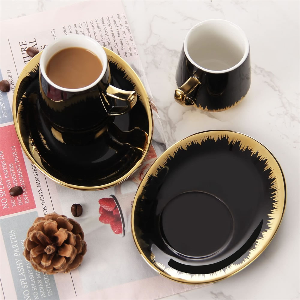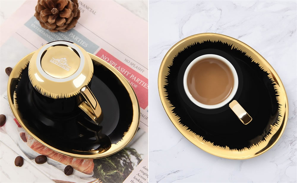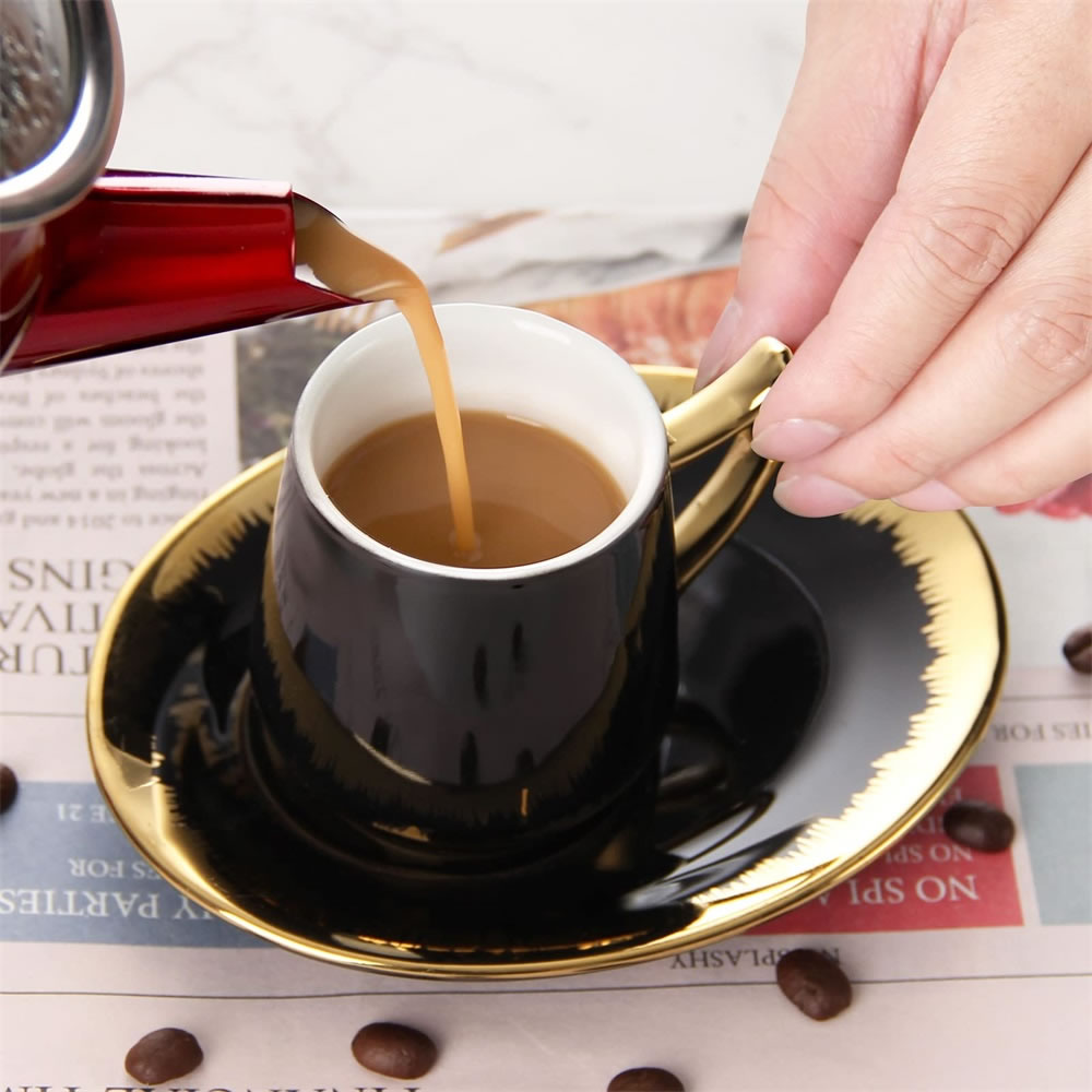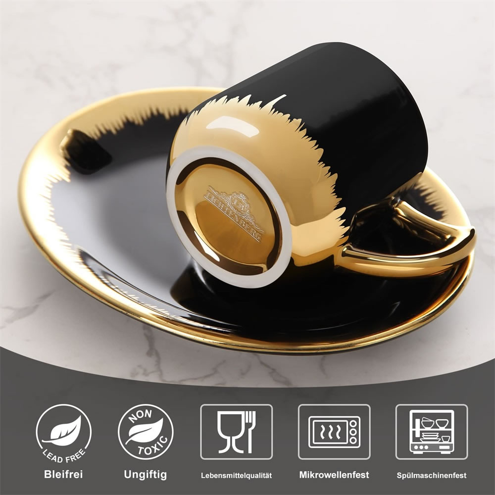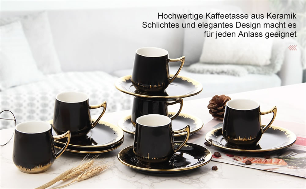 Das Espressotassen Set hat eine schöne Form, mit einem runden Tablett mit goldenem fließendem Rand; Die Farbkombination von Schwarz und Gold ist hell und stark, was Luxus und edles Aussehen in die Tasse bringt und Ihren Tisch erhellen kann. Dieses Set von Espressotassen ist für alle Gelegenheiten geeignet und kann jeder Party oder Küchenschrank eine schöne Farbe hinzufügen. Mit der Einstellung, raffiniertes Leben zu umarmen, wird dies definitiv eine Überraschung in Ihrem Leben sein!
