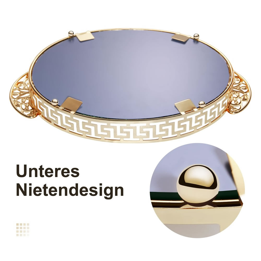 Der Boden besteht aus hochwertigem Glas mit eleganten Mustern, und der Metallgriff ist exquisit und robust. Vier Auflagepunkte und ein kratzfester Boden sorgen für die Stabilität des Tabletts und schützen Ihren Tisch vor Kratzern.