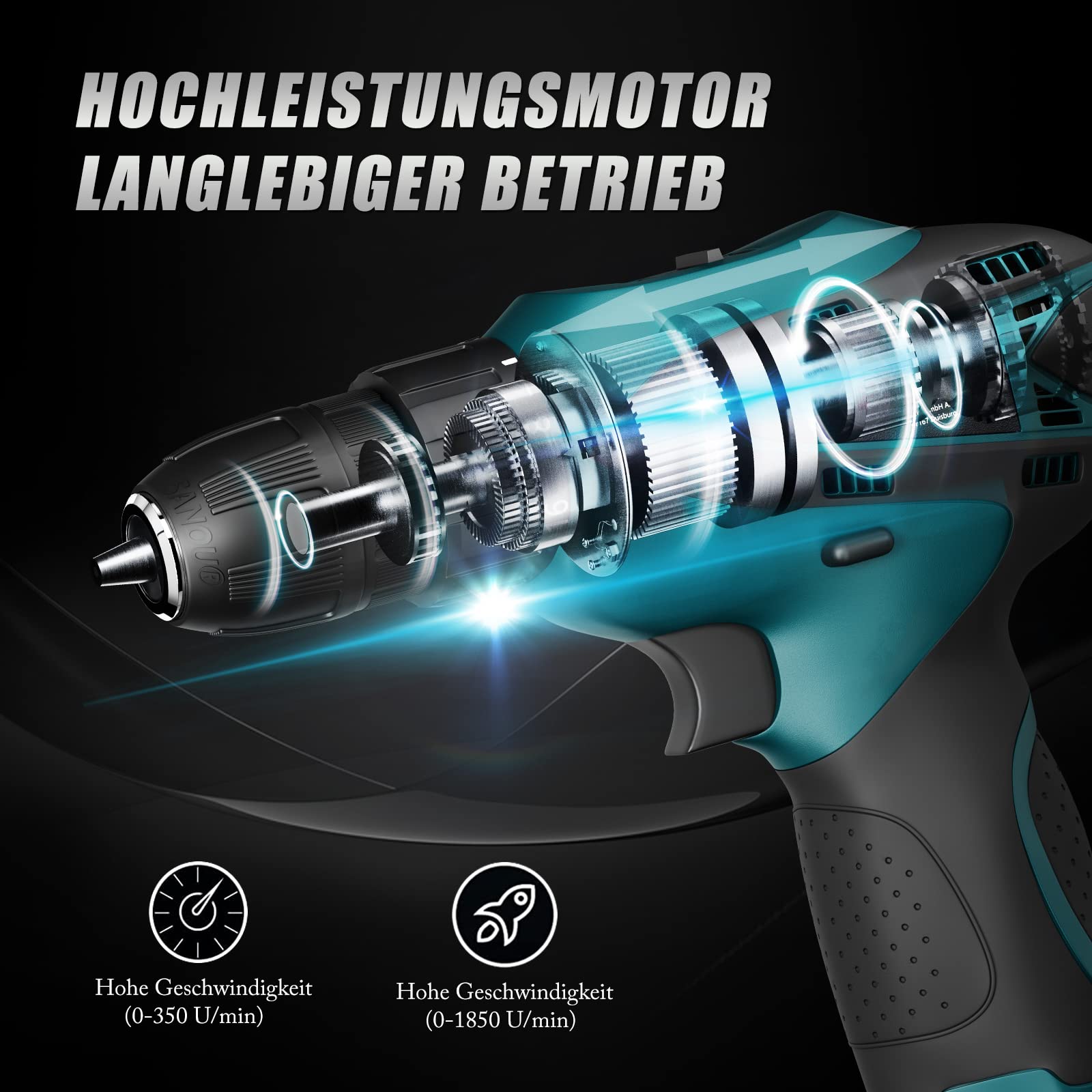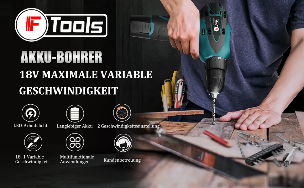 Der 18V akkuschrauber von IF Tools ist mit 2 1800-mAh-Akkus und einem 1-Stunden-Schnellladegerät für starke und stabile Leistung und lange Laufzeit ausgestattet. Industrielle Kupfermotoren bieten große Leistung. Diese Bohrmaschine verfügt über ein LED-Arbeitslicht. Es schaltet sich automatisch ein, wenn der Auslöser für die Geschwindigkeitsregelung gedrückt wird.
