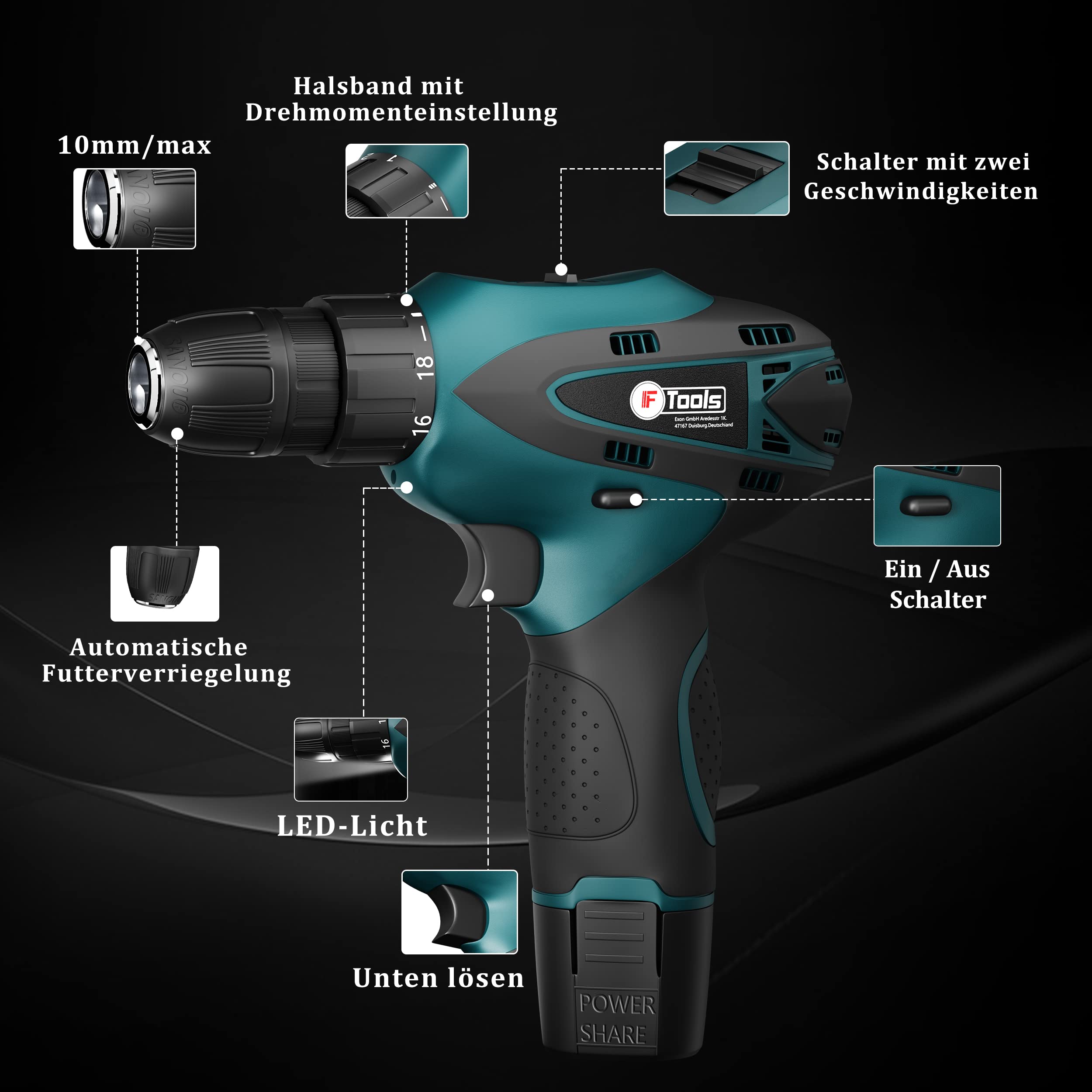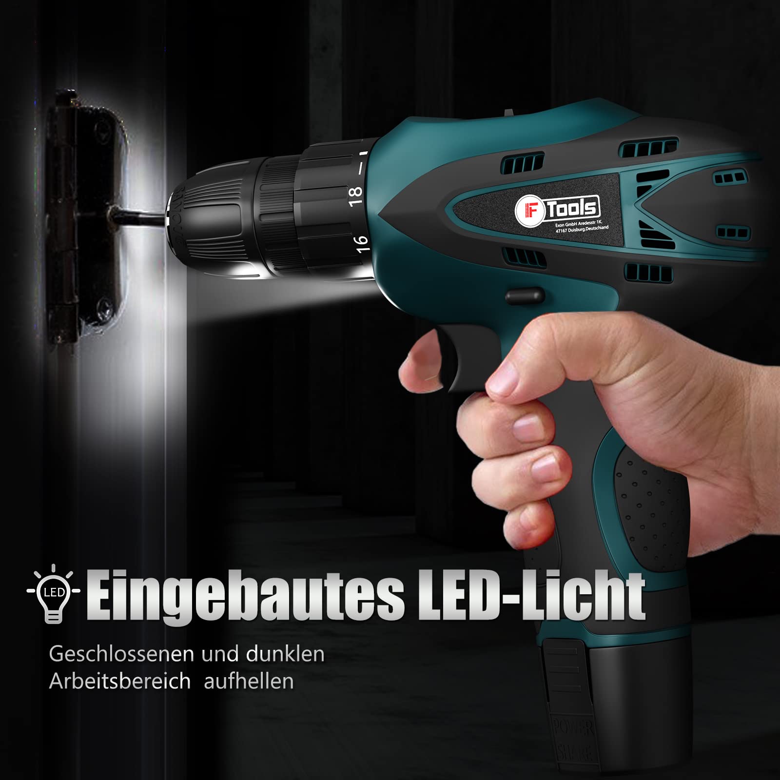 Der 18V akkuschrauber von IF Tools ist mit 2 1800-mAh-Akkus und einem 1-Stunden-Schnellladegerät für starke und stabile Leistung und lange Laufzeit ausgestattet. Industrielle Kupfermotoren bieten große Leistung. Diese Bohrmaschine verfügt über ein LED-Arbeitslicht. Es schaltet sich automatisch ein, wenn der Auslöser für die Geschwindigkeitsregelung gedrückt wird.